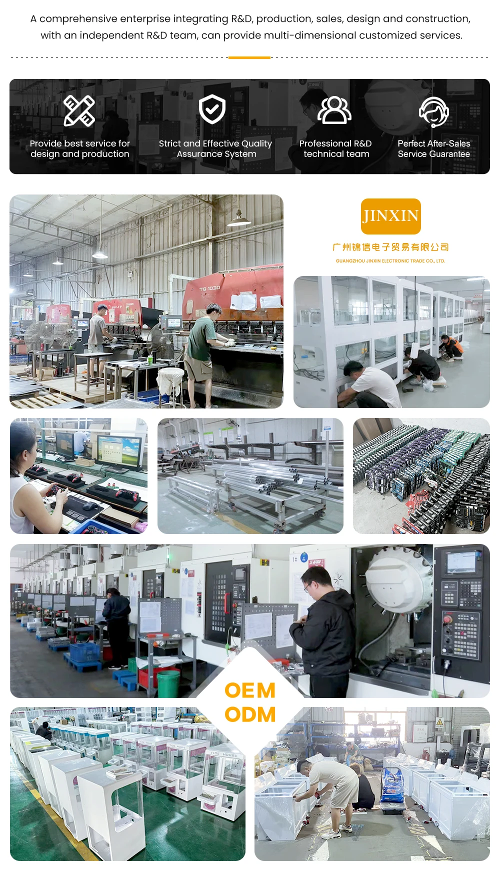 Guangzhou Jinxin Electronic Trade Co. Ltd. was established in 2019. It is located in Guangzhou, Guangdong province. We have 10 years of experience in game industry. Main products: Catching claw machine, Prize-winning game machines, Boxing machines, Basketball machines, Money changers, Arcades, Coin-operated video games, Gift arcades and large-scale video game equip-ment. We welcome OEM/ODM customers from all over the world to cooperate with us for a long time.